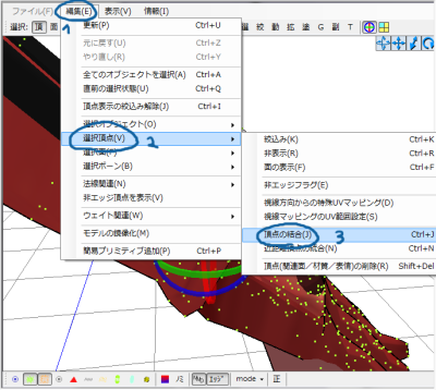 同じ窓の『編集』を開いて、『選択頂点』さらに『頂点の結合』と選択します。