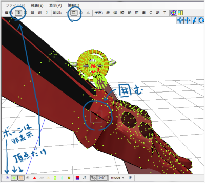選択範囲を□(しかく)にして、隙間が開いている頂点二つを囲みます。
